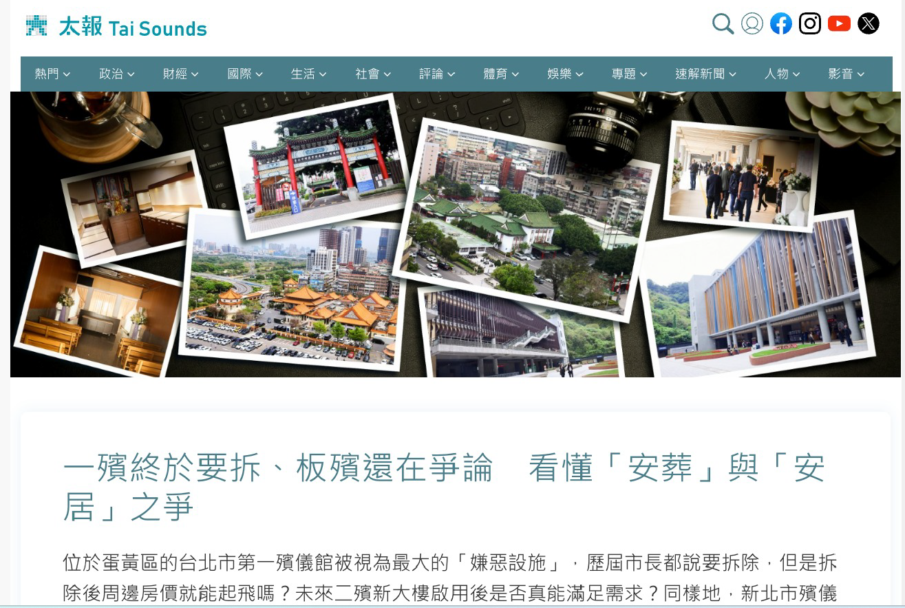- 殯儀館常被視為嫌惡設施,隨著台北市第一殯儀館拆除,新北殯儀館也陷入改建與遷移爭議。在地居民發起改建連署。透過報導與分析,讓讀者瞭解這兩地殯儀館的歷史淵源、爭議根源及未來可能影響與衝擊。面對死亡率上升、殯葬需求增加,全台殯儀館興建屢遭抗爭,未來安葬與生活間的平衡與抉擇,將從殯葬儀式調整等方向尋找解方。