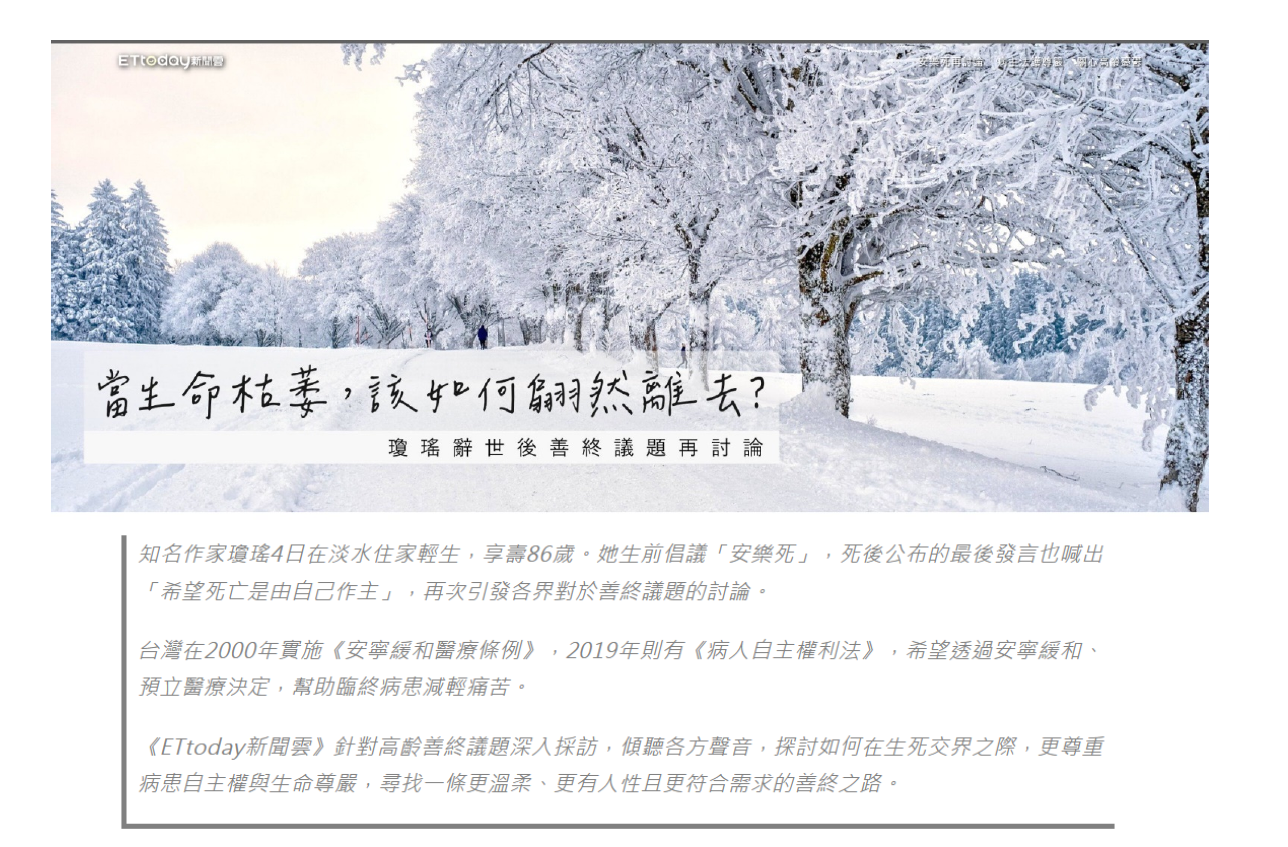 - 因作家瓊瑤輕生引發各界關注,進而報導探討善終及病人自主權議題,呈現安寧緩和醫療、病人自主權利法等相關制度運作,並聚焦安樂死合法性爭議同時,也強調提早規劃醫療決策,減少臨終痛苦與家屬壓力。同時,更關注台灣高齡者自殺率高居高不下,提供警訊與求助資源,盼提高社會對高齡者心理、生理健康及生命尊嚴議題的重視。
