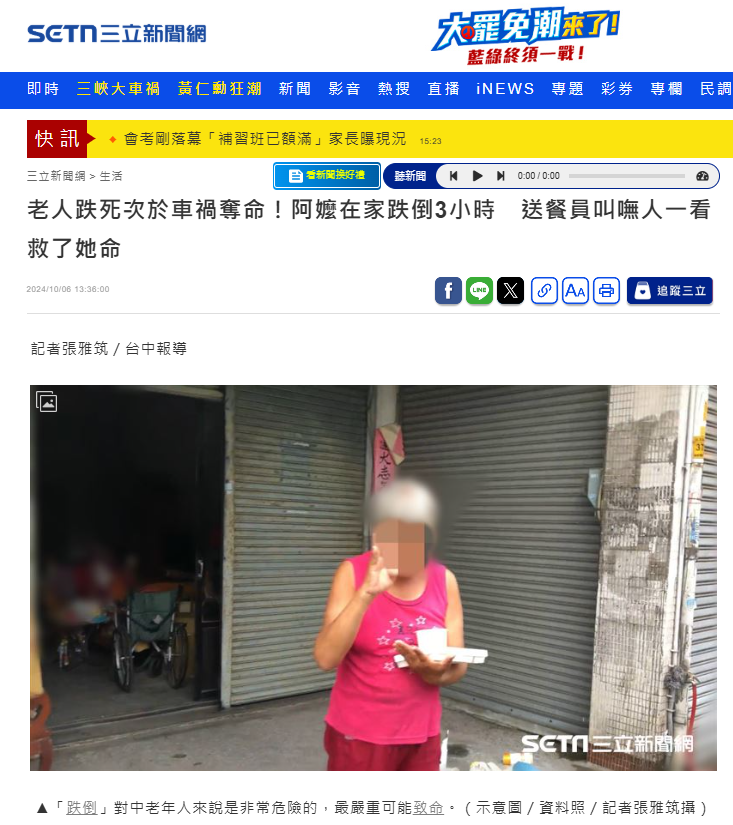 - 大家提到意外死亡,常聯想到車禍或猝死,卻忽略高齡者跌倒的風險。台灣邁入高齡社會,許多長者一人獨居,若跌倒昏迷,恐數日後才被發現。送餐服務解決購餐不便外,更是社會安全的關懷網絡,降低風險。老人跌倒致死率僅次於車禍,透過此議題連結送餐服務,呼籲社會關注高齡生活風險,思考政府與民間如何協力打造安全老後。