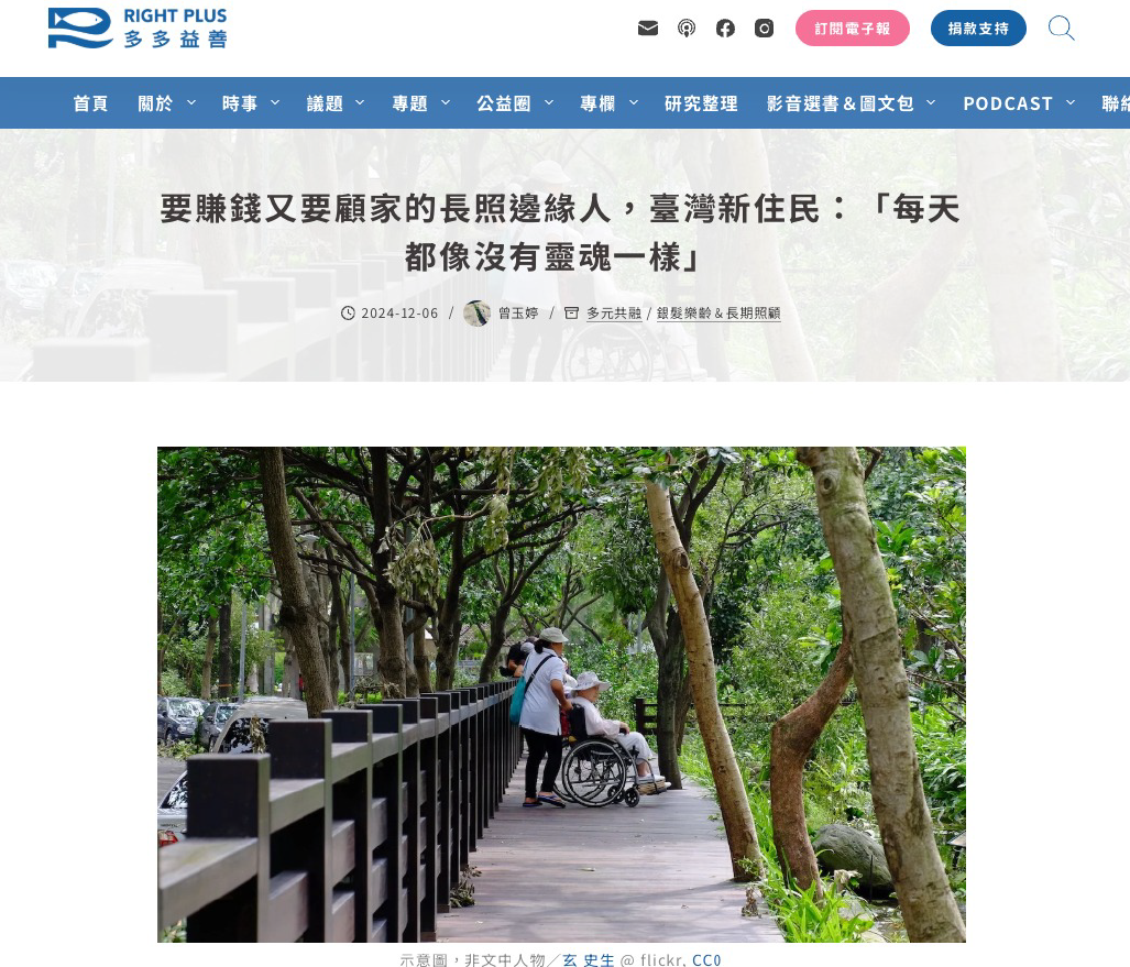 - 跨國婚姻開放逾30年,許多新住民邁入中老年,也面臨長照困境。本報導揭示其照顧困境,並訪問服務新住民的組織,指出長照資訊不夠友善、缺乏多語服務,以及家人反對申請等問題,並提出培訓長照通譯、提升文化敏感度等改善建議,期盼社會理解新住民的長照困境與貢獻,推動更包容的長照政策,讓新住民的長照家庭獲得適切協助。