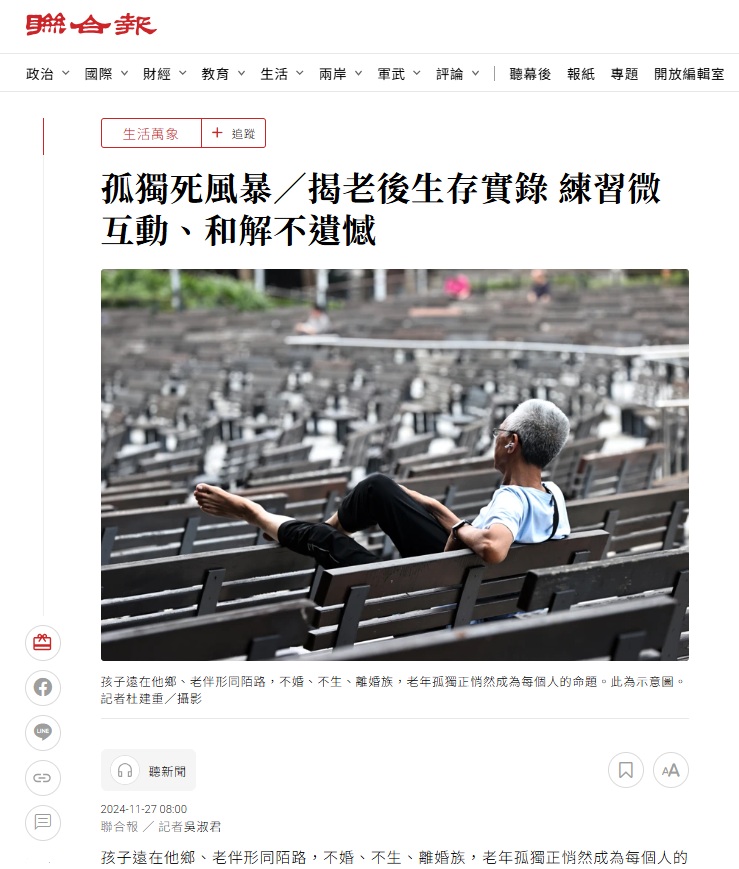 - 本專題探討中高齡就業歧視、老宅困境、居家醫療落差、在地安老實踐與孤獨死議題。團隊走訪城市與偏鄉,透過對長者、照顧者、企業與政府單位的多面向訪談,輔以官方統計、實地觀察與人物故事,完整呈現台灣衝擊「超高齡社會」的真實情境,期待檢視制度缺口,結合國內外先例與專家見解,提出因應之道,期盼各界關注與對話。
