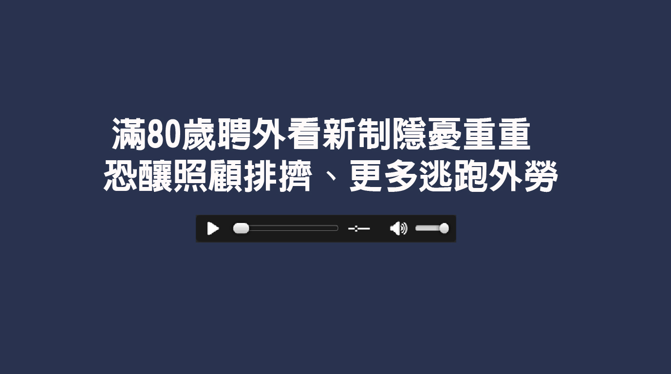 - 立法院去年底三讀修正「就業服務法」,80歲以上長者聘僱外籍看護免經醫療機構評估,各界意見不一,民間團體憂心產生照顧排擠效應,導致重度失能、失智者面臨請不到看護的困境,此篇新聞報導民間團體的擔憂與現況反映、第一線醫師的觀察,以及政府初步的因應。