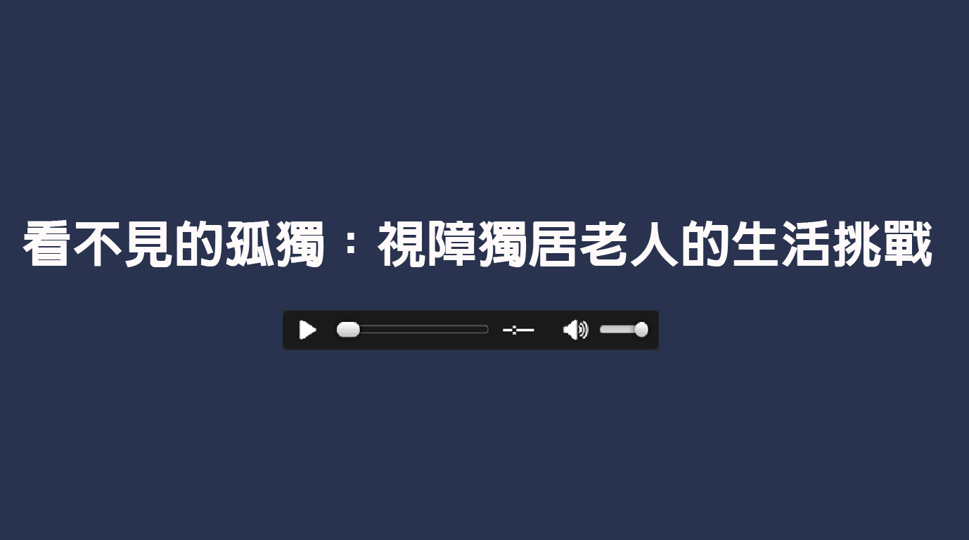 - 深入了解視障獨居老人的生活,探討他們面臨的生活挑戰。從煮飯、打掃、購物等基本需求,到出門行動上的諸多限制。以及因視力受損,更增加跌倒、服藥困難、就醫不便等健康風險,也使他們更加覺得孤獨與疏離,甚至陷入憂鬱或自我封閉。邀請大家關注這群長輩,傾聽他們的需求與心聲,陪伴他們走出孤寂,尋回生活的光亮與溫暖。